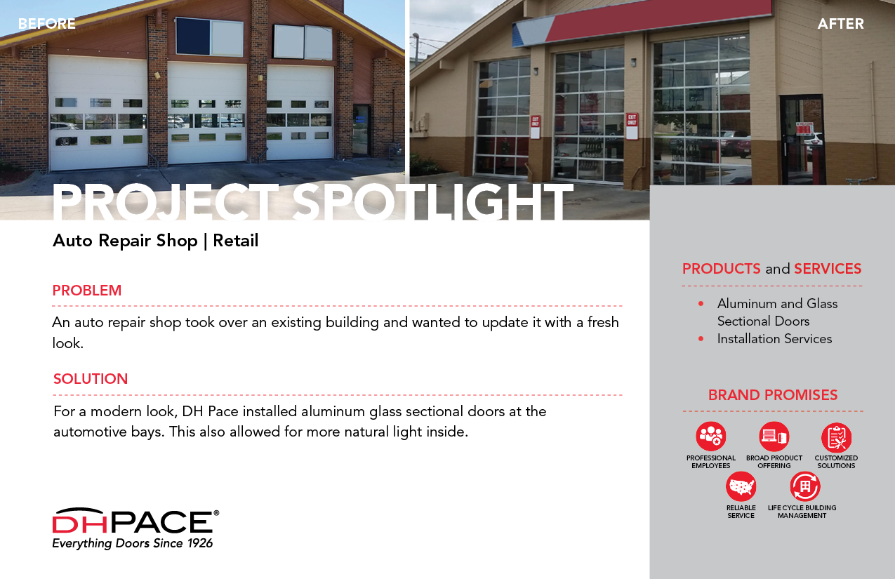 For a modern look, DH Pace installed aluminum glass sectional doors at the automotive bays. This also allowed for more natural light inside.
