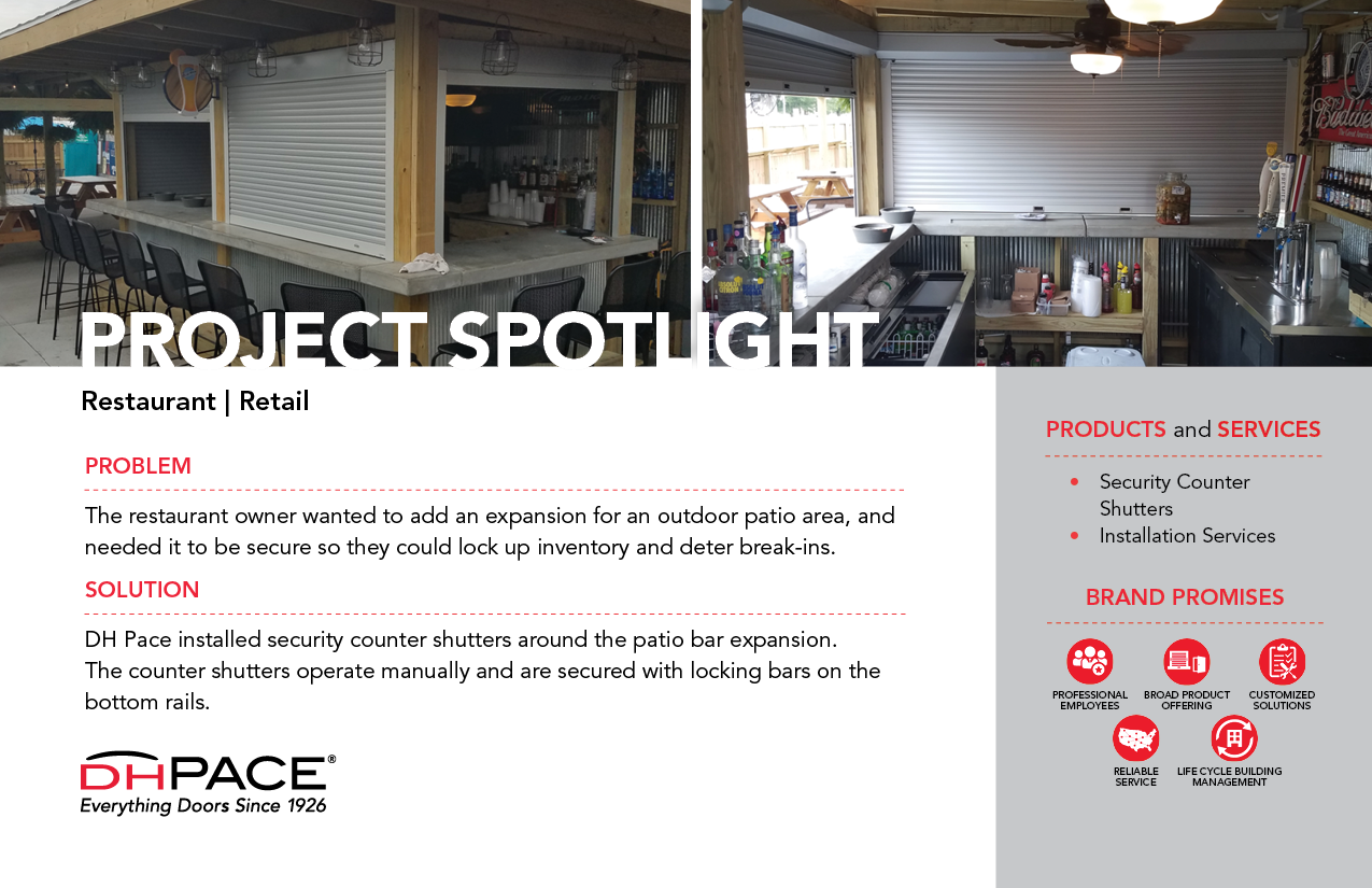 DH Pace installed security counter shutters around the patio bar expansion. The counter shutters operate manually and are secured with locking bars on the bottom rails.